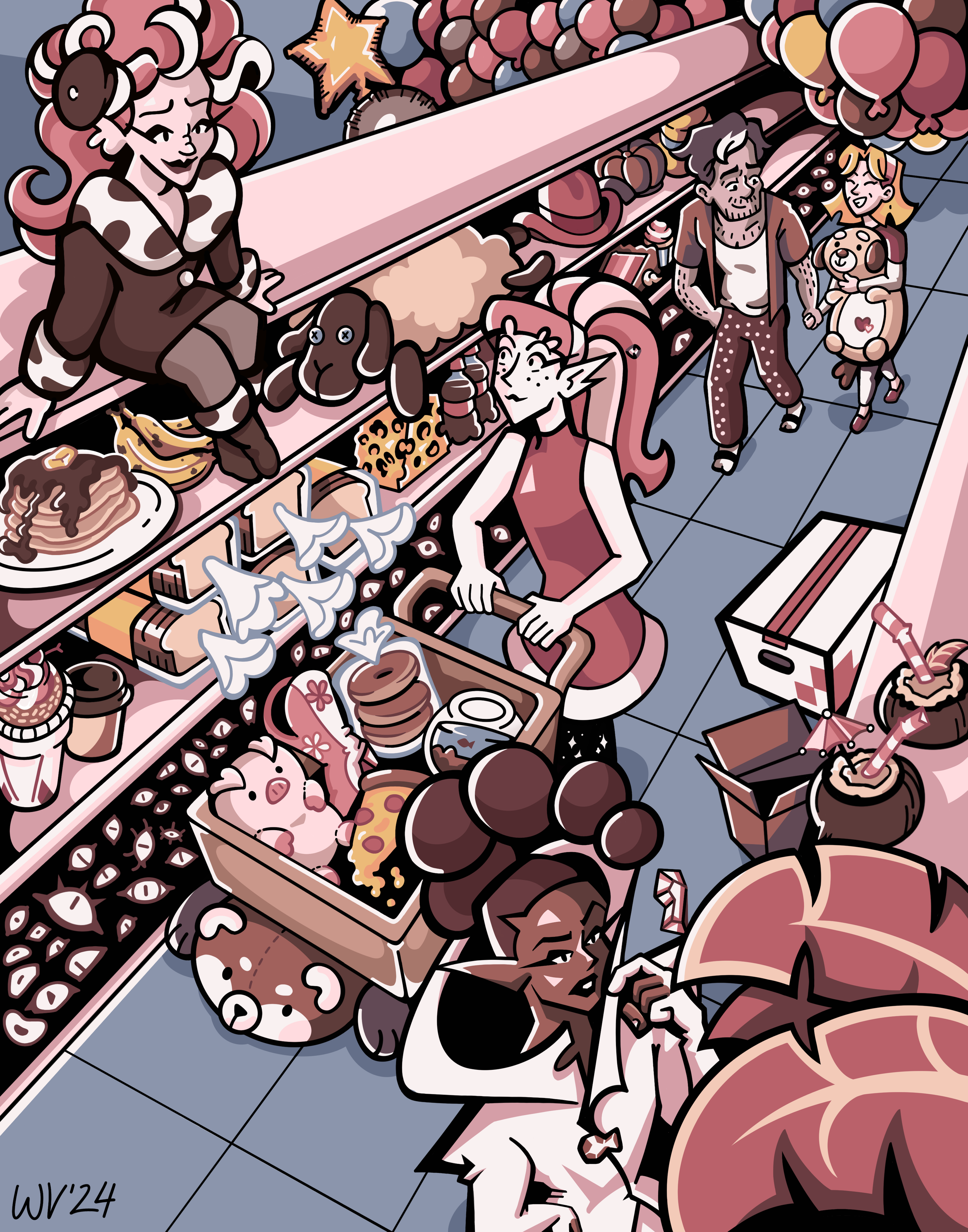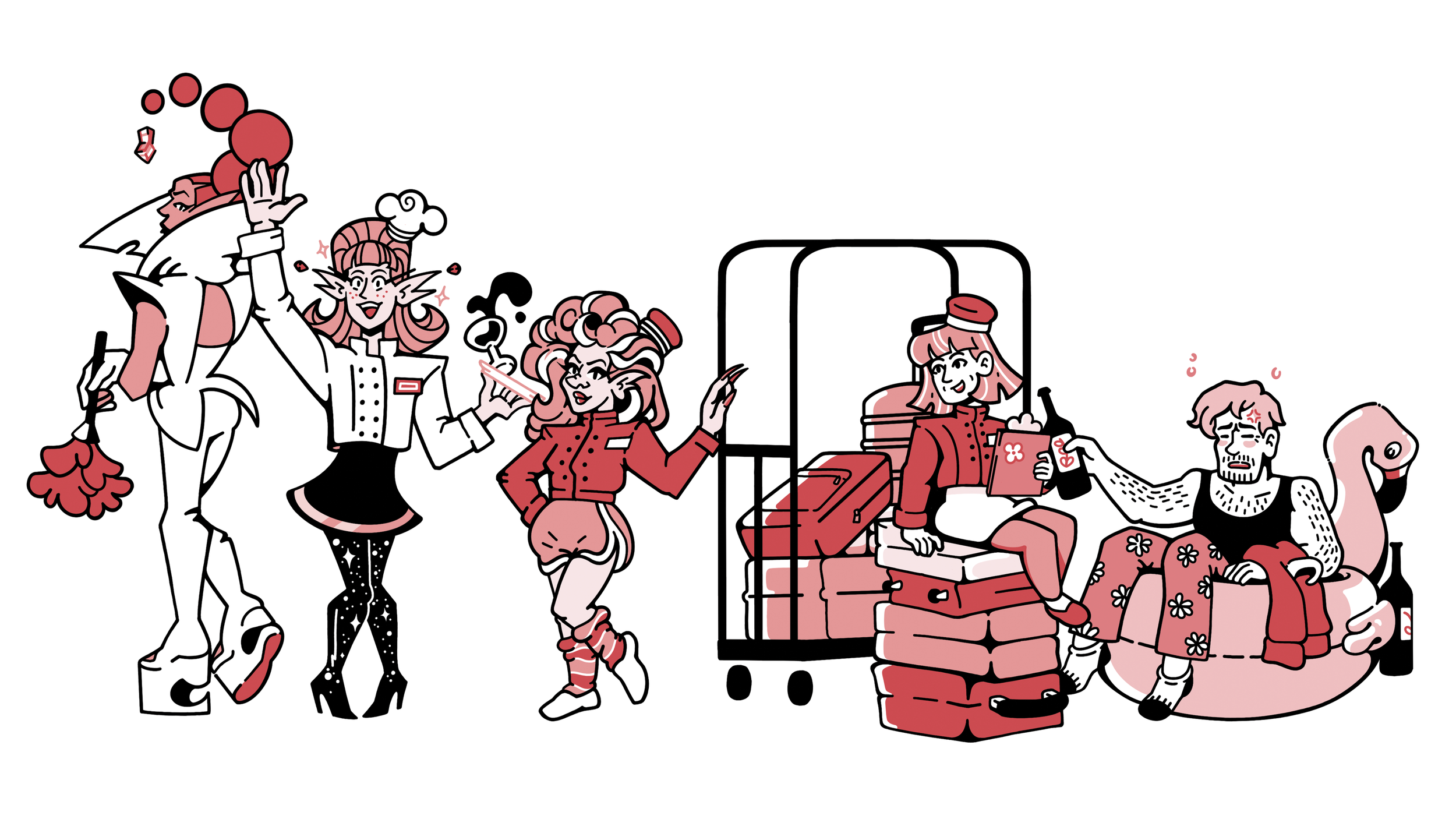 U.F.O-Tel: Aliens Everywhere features a set of five unique characters with an intergalactic secret working together at a hotel. These characters were later revitalized for a narrative image project dedicated to showcasing their zany personalities, individual styles, and charming group dynamics.